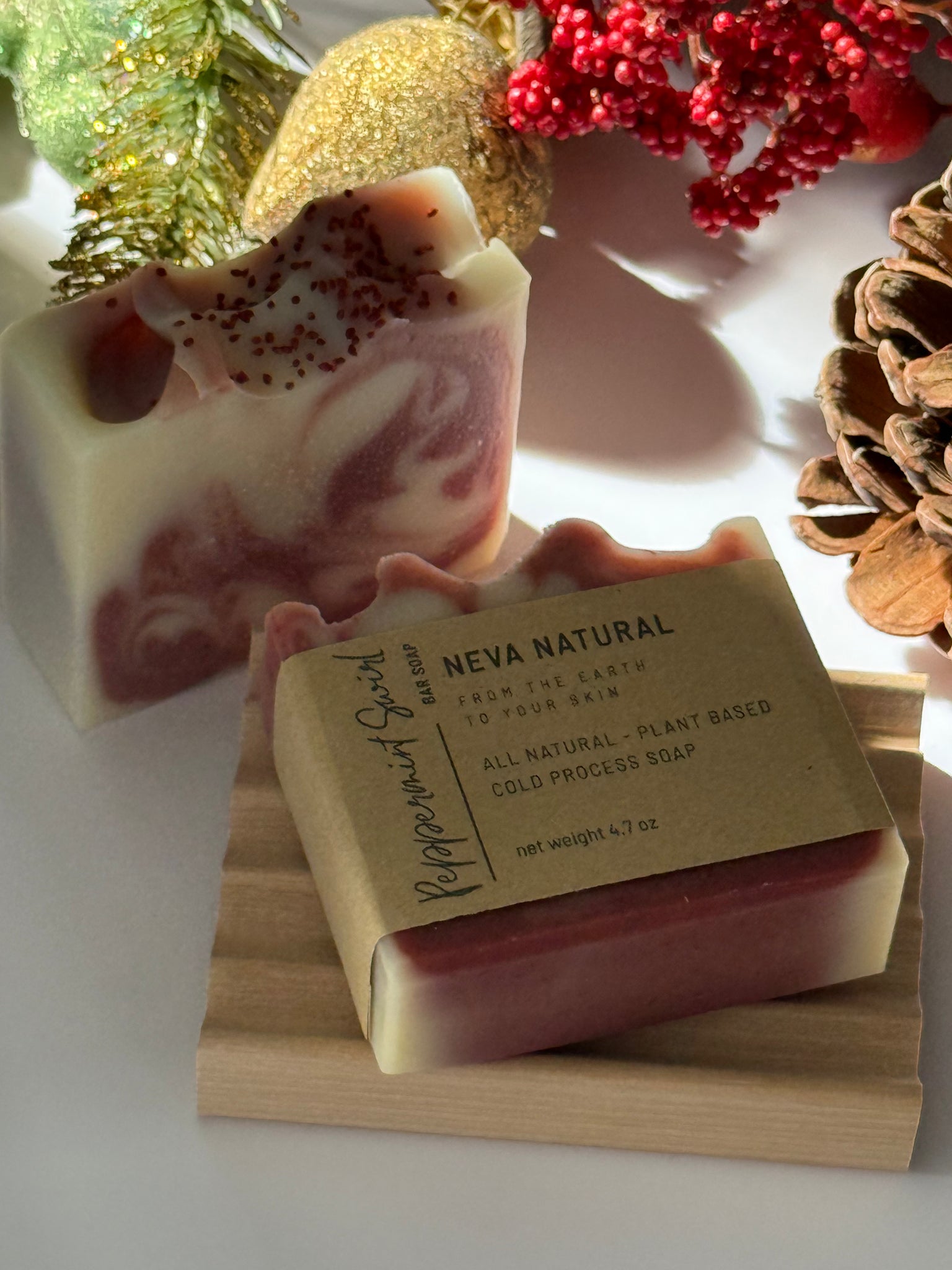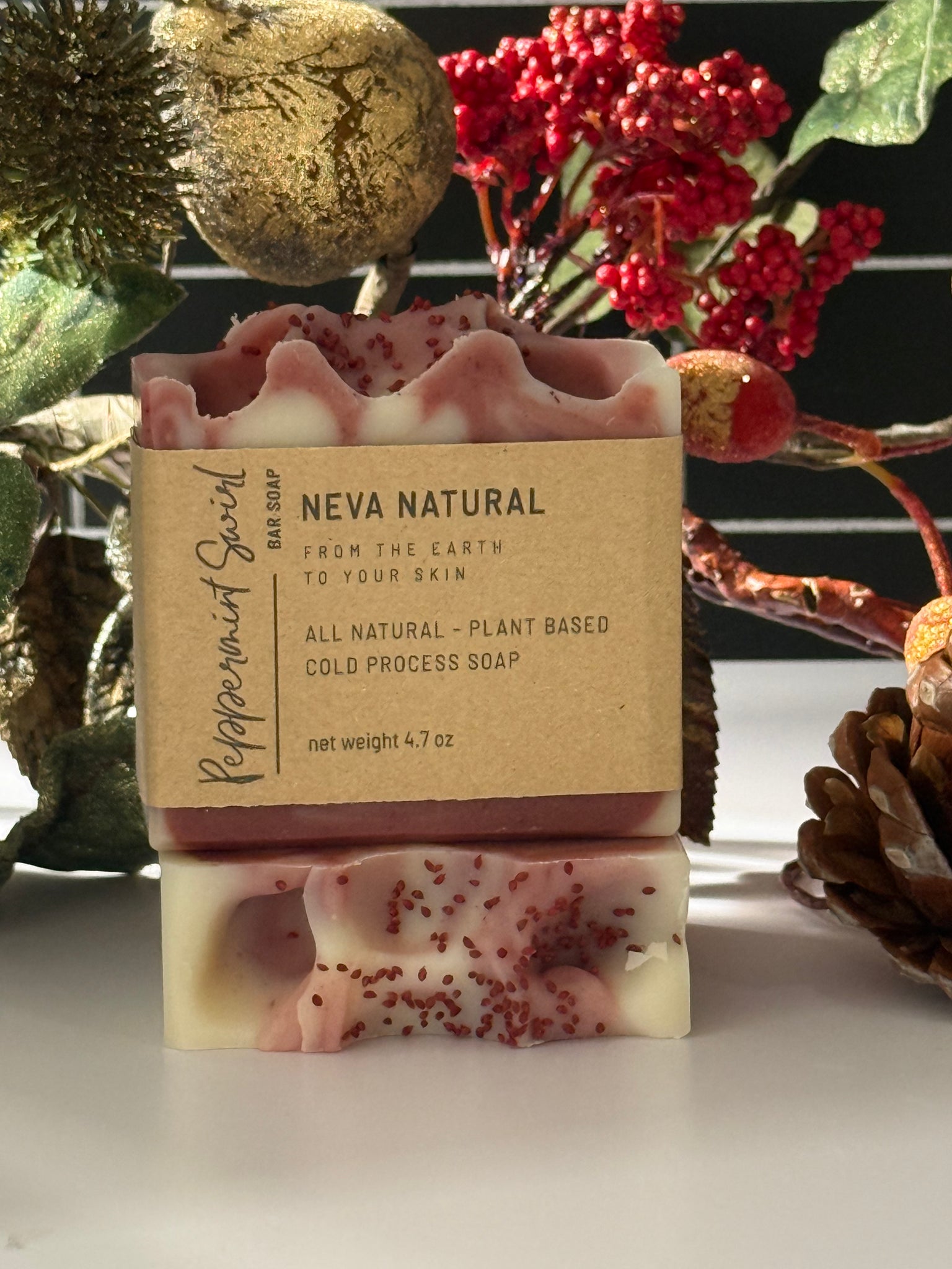 Peppermint Swirl soap is all natural and palm oil free. made with organic coconut milk and luxury oils and butters, like avocado oil and organic cocoa butter. This soap is naturally colored with red madder root powder and rhubarb root powder for beautiful red swirls. the scent is fresh, clean and minty.